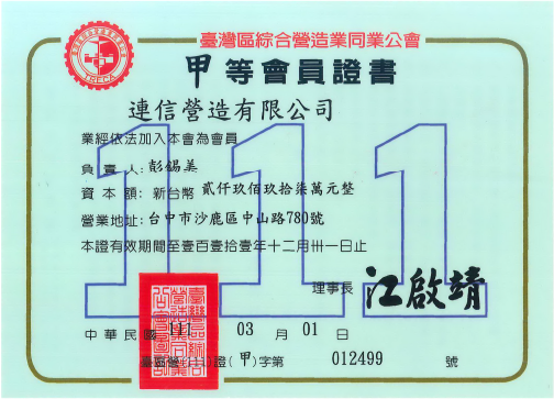 甲等綜合營造業登記證書