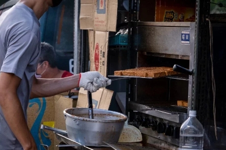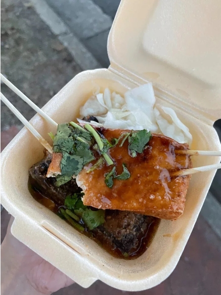 自強夜市內的【黃記深坑臭豆腐】也有不少死忠顧客,從遠處就能聞到臭豆腐味道,業者將臭豆腐與米血做搭配組合,非常特別。